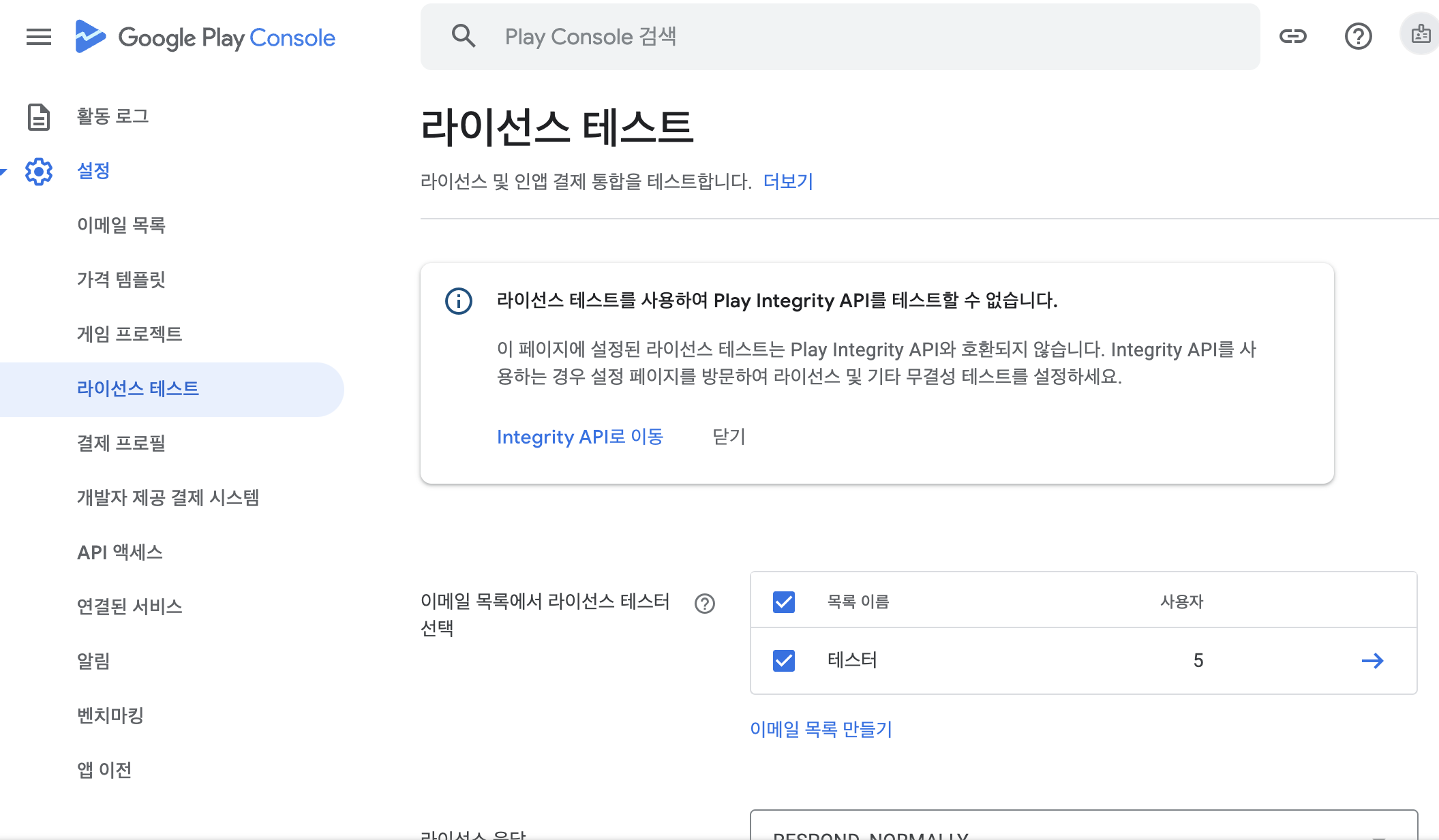 등록한 앱이 아니라 google play console에 들어가서 설정에 라이선스 테스트를 누른다. 그리고 이메일 목록에 라이선스 테스터할 google play 아이디를 추가한 후, 테스터를 체크한다. 라이선스 응답은 RESPONDE_NOMALLY를 선택하면 된다.