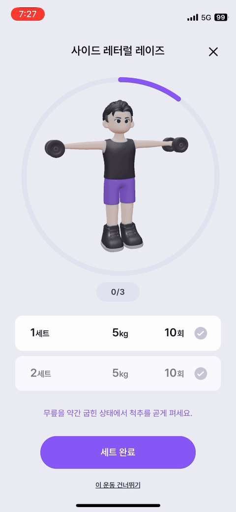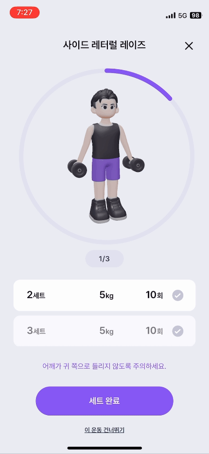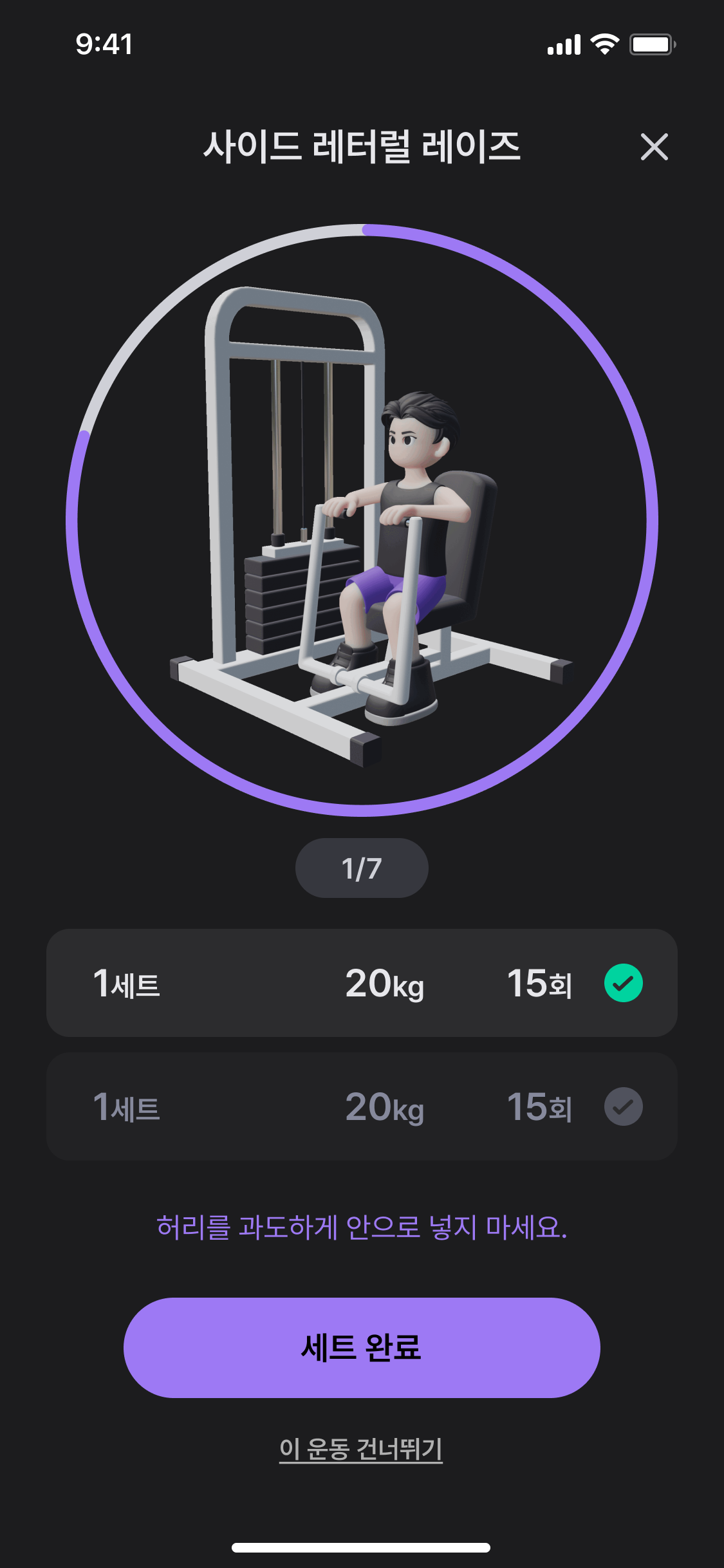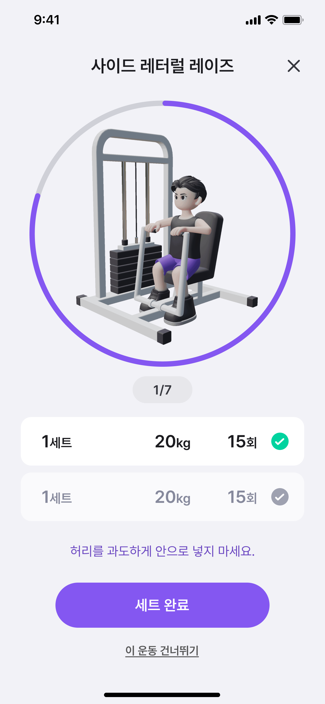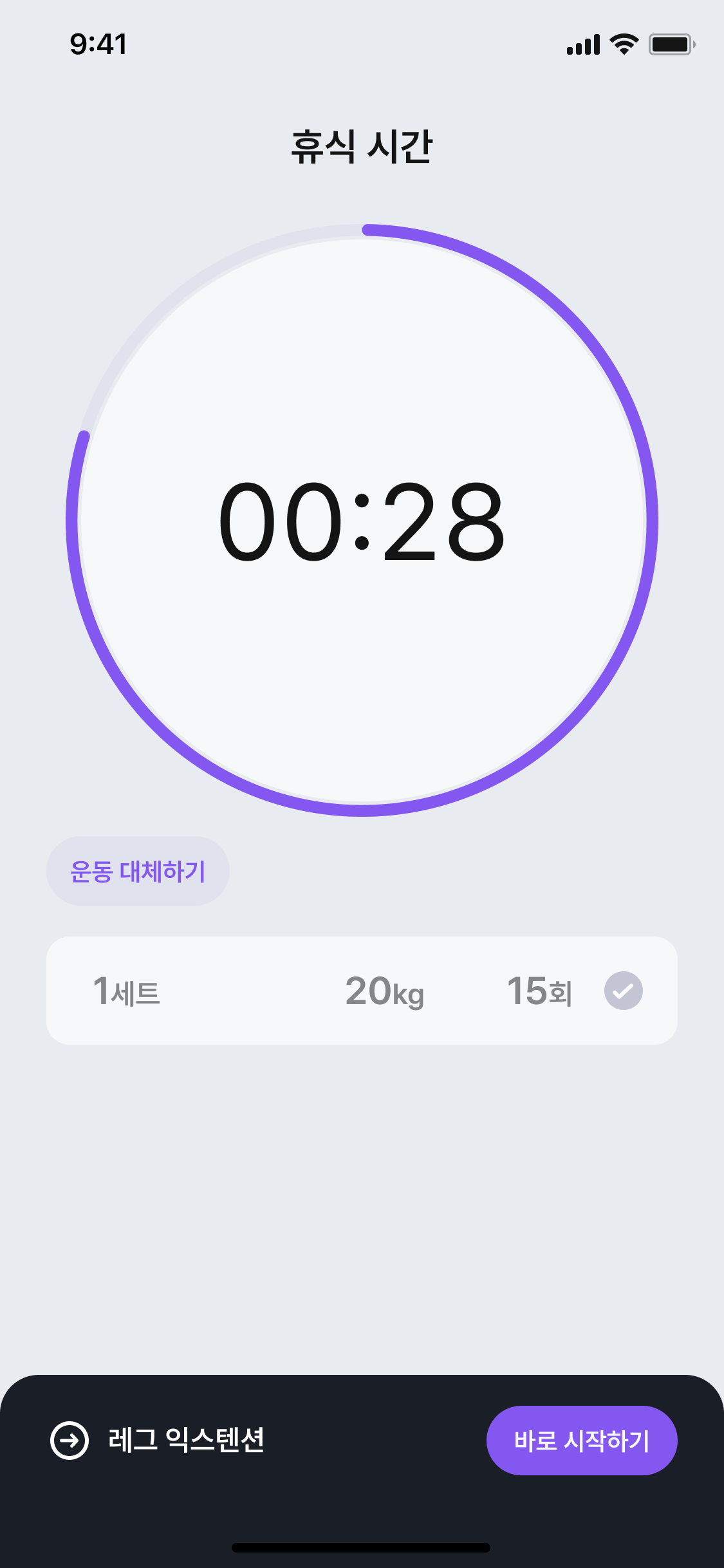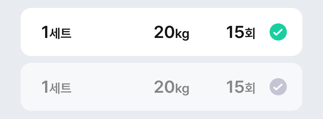 운동 중에는 타이머가 진행되며, 세트 완료 버튼을 누르면 오른쪽의 체크박스가 회색 → 민트색으로 변해 운동이 완료된다. 완료한 세트는 위쪽으로 올라가 사라진다.